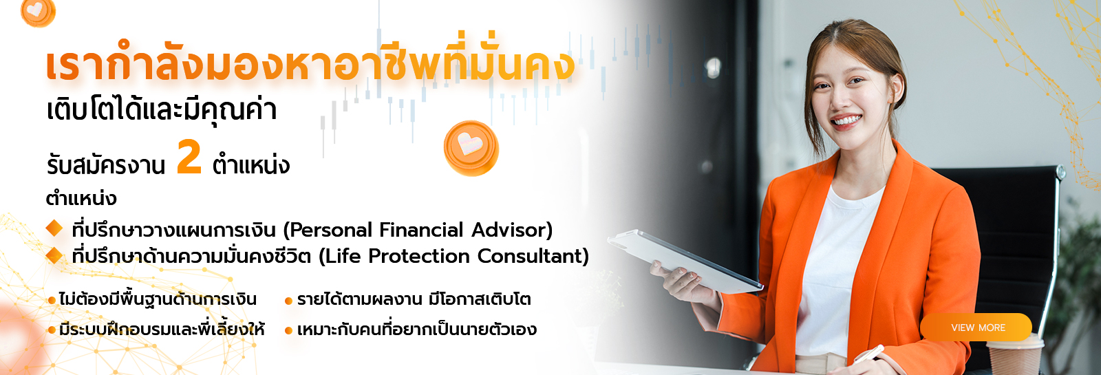 เราเป็นองค์กรที่ปรึกษาทางด้านการเงินแนวหน้าของเมืองไทย ที่พร้อมส่งมอบเป้าหมายทางการเงินสำคัญ ให้กับทุกๆ คนที่มีความต้องการความมั่นคั่งทางการเงิน และความมั่นคงในชีวิต